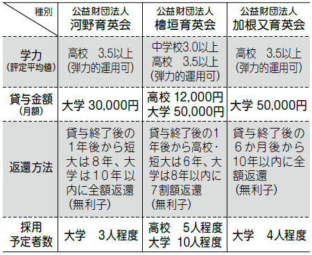 ※応募用紙は市内の中学校、高校にあります。在学する学校に提出ください。また、他の奨学金との併用など詳しくは問い合わせください。