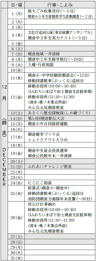 あさくら便りでお知らせしている行事予定が変更になる場合があります。最新の情報は市のホームページまたは各問合先でご確認ください。学校の行事予定については、ホームページでご確認ください。