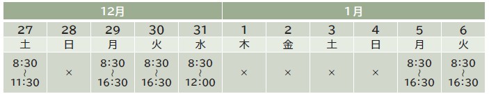 年末年始のお休みは、12月27日(土)~1月4日(日)です