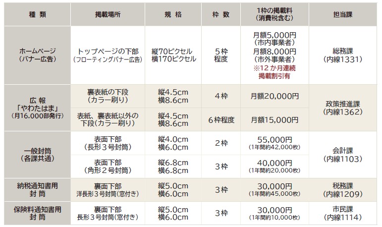 広告媒体により募集方法等が異なりますので、詳細は市のHPをご覧いただくか、各担当課までお問い合わせください。