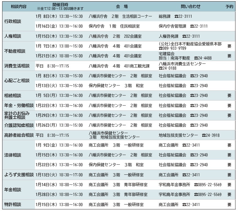 くらし 無料相談のご案内 32/39 前の記事 次の記事 発行日 : 2026年01月01日 自治体名 : 愛媛県八幡浜市 広報紙名 : 広報やわたはま 2026年1月号 日々のくらしで困っていることはありませんか? Tweet シェアする 図書館だより 今月の納期