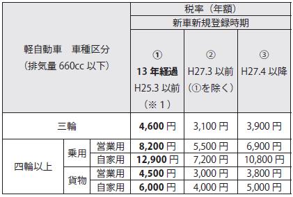 ※1 電気、天然ガス、メタノール、および混合メタノール軽自動車、ガソリンを内燃機関の燃料として用いる電力併用軽自動車の税率は(2)または(3)です。