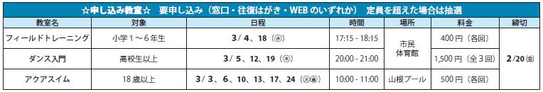 スポーツ 市民体育館からのお知らせ 28/38 前の記事 次の記事 発行日 : 2026年02月01日 自治体名 : 愛媛県新居浜市 広報紙名 : 市政だより「にいはま」 令和8年(2026年)2月号 〇は室内シューズ、☆はヨガマットかバスタオル持参。 問合せ:〒792-0864 東雲町1-1-25 市民体育館 【電話】34-1888【FAX】32-4044 Tweet シェアする 2月 講座・イベント(2) あかがねミュージアム