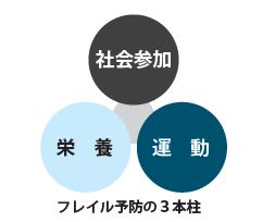 健康と要介護の間の状態で、放っておくと介護が必要になりやすい状態ですが、生活習慣を見直すなど早めの対策で健康な状態に戻ることができます。社会参加・栄養・運動がフレイル予防の3本柱と言われています。