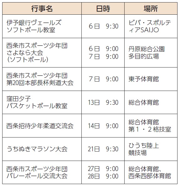 スポーツ 12月のスポーツカレンダー 10/36 前の記事 次の記事 発行日 : 2025年12月01日 自治体名 : 愛媛県西条市 広報紙名 : 広報さいじょう 2025年12月号 行事の日程・場所などは、変更になる場合あり Tweet シェアする 新年市民祝賀会 インフォメーションサロンーイベント・講座(2)