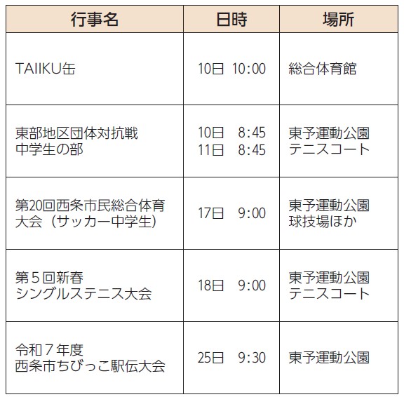 スポーツ 1月のスポーツカレンダー 10/36 前の記事 次の記事 発行日 : 2026年01月01日 自治体名 : 愛媛県西条市 広報紙名 : 広報さいじょう 2026年1月号 行事の日程・場所などは、変更になる場合あり Tweet シェアする インフォメーションサロンーイベント・講座 インフォメーションサロンー健康・福祉