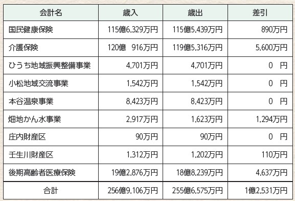 特別会計は、国民健康保険事業や介護保険事業など、特定の仕事をする場合に一般会計とは別に経理する会計のことで、全ての会計で黒字または収支が均衡となっています。