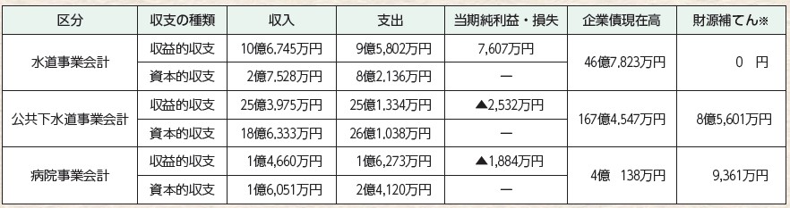 企業会計は、企業経営という観点から独立して経理をする会計のことで、このうち、公共下水道事業会計と病院事業会計(病院が医療サービスから得られる収益を除く)は、料金収入などの収益だけでは経営が難しいため、一般会計から財源不足額を補てんしている状況です。一般会計からの支援に依存しない独立採算に向け、収入の増加や支出の見直しが必要となっています。