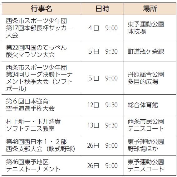 スポーツ 10月のスポーツカレンダー 8/34 前の記事 次の記事 発行日 : 2025年10月01日 自治体名 : 愛媛県西条市 広報紙名 : 広報さいじょう 2025年10月号 行事の日程・場所などは、変更になる場合あり Tweet シェアする インフォメーションサロンーイベント・講座(2) ハロウィンヴィレッジ 2025