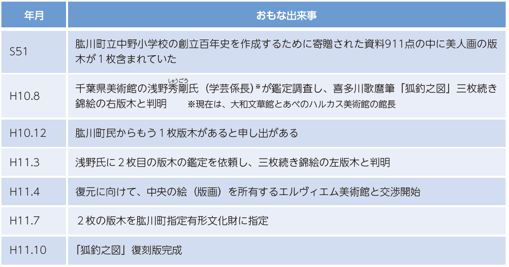 浮世絵木版画「狐釣之図」は、本来3枚続きで構成された作品ですが、肱川町で発見されたのは左右の2枚のみです。世界に現存する歌麿の版木は、大洲市に残されている2枚を含めて、わずか4枚と言われています。