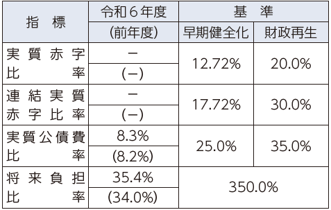 財政の健全度を示す健全化判断比率において、令和6年度決算では、実質公債費比率が8.3%、将来負担比率が35.4%となり、いずれも国が定める早期健全化基準を下回りました。