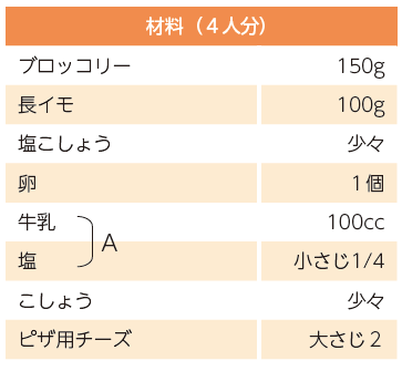 (4)耐熱用の皿にブロッコリーと長イモを並べ、(3)を流し、上からチーズを散らす。