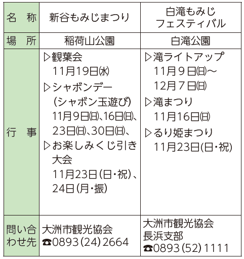 11月1日(土)~30日(日)の期間中、新谷稲荷山公園と白滝公園で、恒例のもみじまつりを開催します。