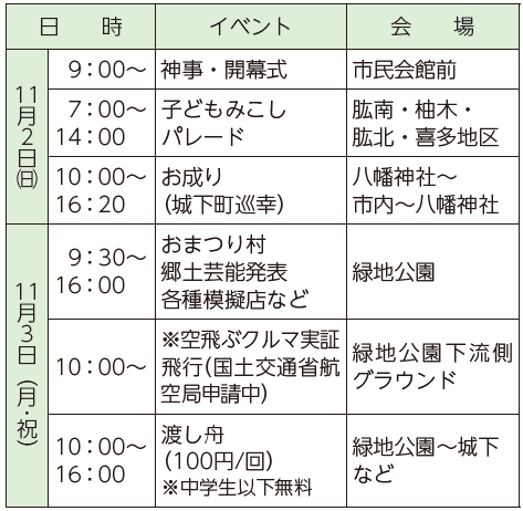 大洲の秋の恒例行事「大洲まつり」を開催します。おまつり村では、郷土芸能発表や、各種模擬店などでにぎわいます。ぜひお越しください。
