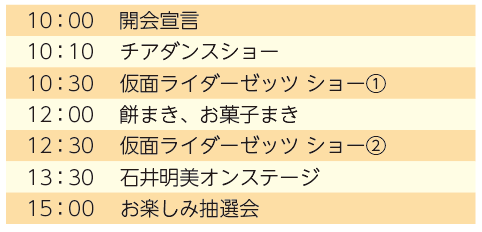 各種団体による出店のほか、仮面ライダーゼッツショーや石井明美(あけみ)オンステージなど楽しいイベントが盛りだくさんです。入場・観覧無料ですので、ご近所ご家族お誘い合わせの上、ぜひお越しください。