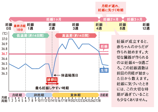 そのため、基礎体温を測ることで、次の月経予定日や妊娠しやすい時期、さらに妊娠の可能性も予測することができます。