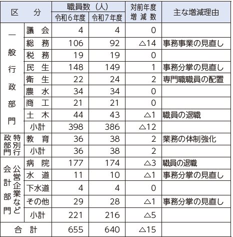 (4)部門別職員数の状況と主な増減理由(R7.4.1現在)