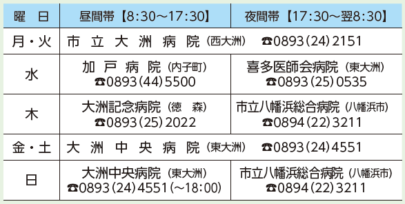 くらし 救急当番病院 47/57 前の記事 次の記事 発行日 : 2025年11月25日 自治体名 : 愛媛県大洲市 広報紙名 : 広報おおず 2025年12月号 ※曜日によって救急当番病院は変わります。昼間・夜間の救急などのご相談は、その日の救急当番病院にご連絡ください。 Tweet シェアする 子ども医療電話相談#8000 大洲喜多休日夜間急患センター
