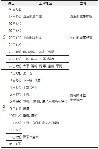 駐車場不足や寒い中での長時間待機などを改善するため、今年度は伊予地域の会場を地区公民館(大平・中村・上野)から市役所に変更します。駐車台数に限りがあるため、なるべく徒歩や自転車、コミュニティバスなどでお越しください。ご理解とご協力をお願いします。