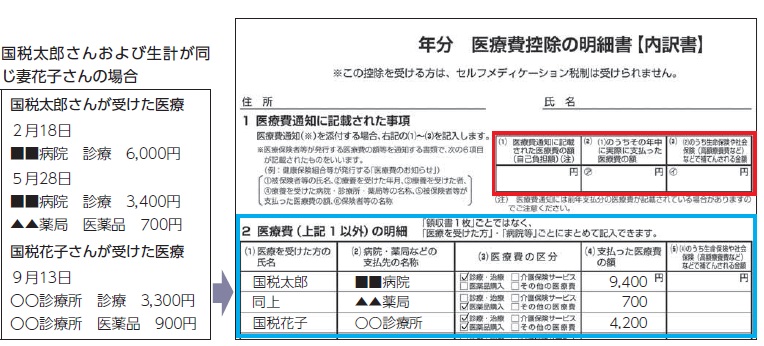 (2)医療費通知が届いていないなどの理由で領収書を使用する場合は、実際に支払った医療費を下図の青枠に記載してください。