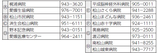 健康 1次救急医療機関・2次救急医療機関 25/28 前の記事 次の記事 発行日 : 2026年01月01日 自治体名 : 愛媛県伊予市 広報紙名 : 広報いよし 2026年1月号 ◆1次救急医療機関 ●松山市医師会休日診療所 (日曜日・祝日) 【電話】915-3111 ○内科 10~13時、14~17時 ○小児科 11~14時、15~18時 ●松山市急患医療センター 【電話】922-1199 ○内科 月~土曜日、21~24時 ○小児科 毎日、21~翌8時 ◆2次救急医療機関(8時30分~翌8時30分) Tweet シェアする 1月のカレンダー 広報こぼれ話