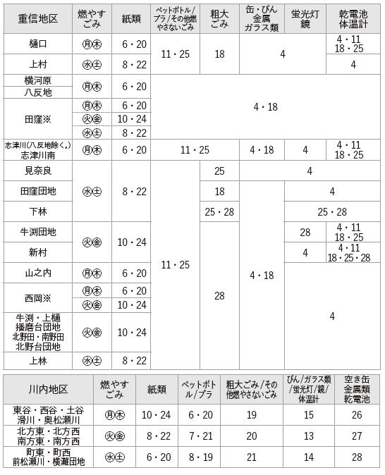 燃やすごみ、紙類は、午前6時~8時に出してください。それ以外は、重信地区は各地区で決められた時間に、川内地区は午前6時~8時に出してください。ごみ分別は、市HPのごみ分別はやわかり帳又は市公式LINEのごみ分別検索機能でご確認ください。