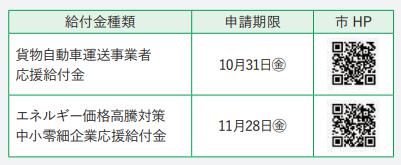 燃料等エネルギー価格高騰や物価高騰の影響で厳しい経営状況の中、事業継続に取り組む、市内中小零細企業等を支援するため、2つの給付金支給事業の申請を受付中です。(※申請できるのは、どちらか1つです。)給付対象者や必要書類など詳細は、市HPをご確認ください。