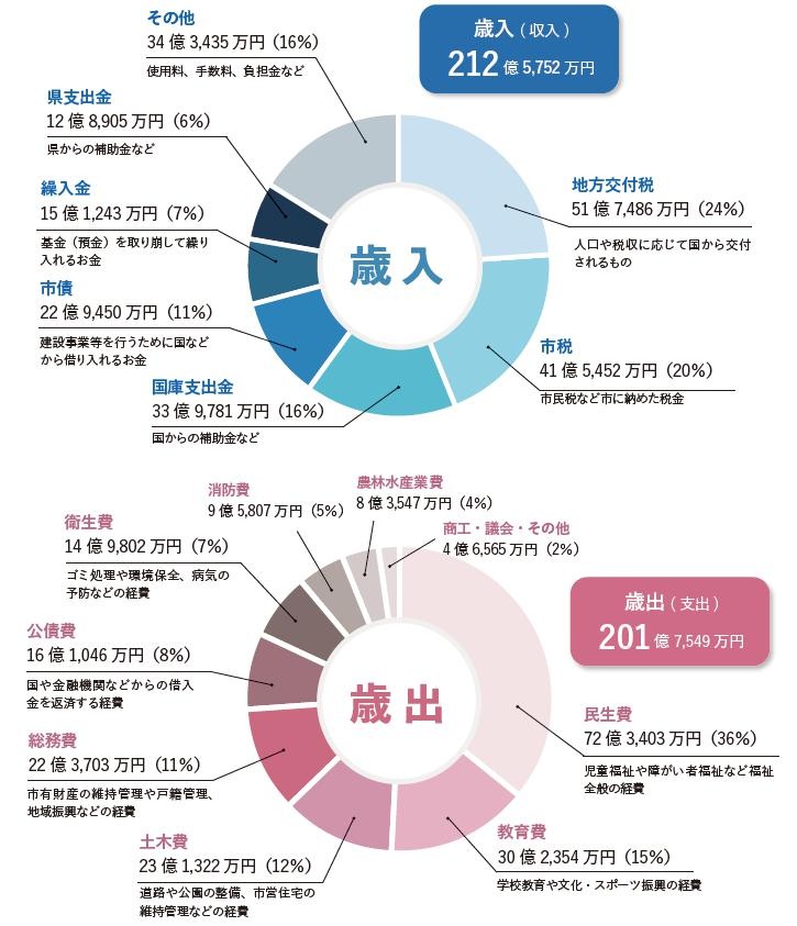 一般会計の令和6年度決算は、前年度比で歳入は約28億600万円、歳出は約29億7,100万円増加しました。歳入では、市債が前年度比約14億400万円(157・6%)、国庫支出金が前年度比約3億円(9・7%)増加したことにより、全体で15・2%の増加となりました。歳出では、教育費が前年度比約13億4,700万円(80・4%)、土木費が前年度比約6億4,500万円(38・7%)増加したことにより、全体で17・3%の増加となりました。また、歳入と歳出の実質的な差額を表わす実質収支は、8億1,840万円の黒字となりました。