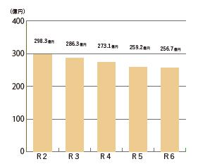 市債は、家計に置き換えると、借金に当たるものです。令和6年度末現在高は256億7,188万円で、前年度末から2億4,727万円減少しています。