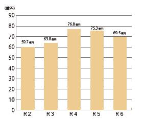 基金は、家計に置き換えると、預金に当たるものです。令和6年度末現在高は69億5,446万円で、前年度末から5億7,520万円減少しています。