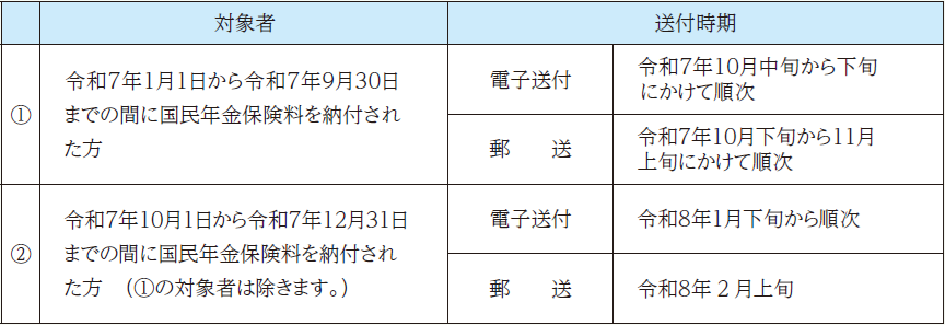 このため、日本年金機構から、下記のスケジュールで「社会保険料(国民年金保険料)控除証明書」が対象の方に送付されます。お手元に届きましたら、大切に保管し、年末調整や確定申告の際に使用してください。