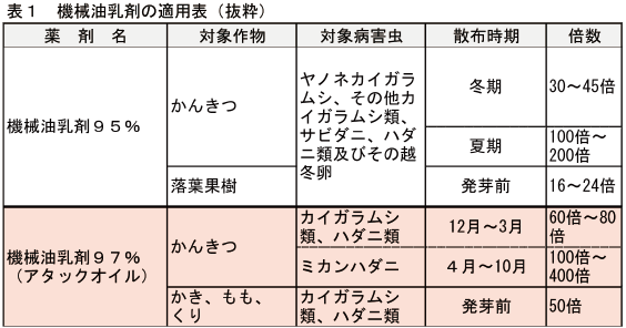 機械油乳剤は12月~3月(厳寒期除く)と6月(夏季)に散布ができますが、薬害発生の観点から散布時期が限定され、春から夏の防除にはアタックオイルなどの高度精製マシンの散布を推奨しています。散布時期や対象害虫により倍数が異なるので注意してください(表1参照)。