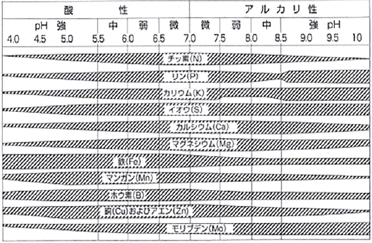 土壌pHは、多くの肥料成分の溶けやすさに影響し、5・0以下の酸性や7・5以上のアルカリ性になると溶けにくい成分が多くあります(図1参照)。作物の養分吸収の過不足は欠乏症や過剰症と呼ばれる生育障害(例…写真1)の原因となり、土壌pHは植物の養分吸収において重要な要素となります。