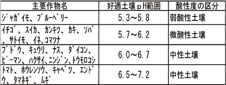 主要な農作物の好適な土壌pHは表1のとおりです。多くの農作物は、中性土壌(土壌pH6~7)でよく育ちますが、例外としてジャガイモやブルーベリーは弱酸性を好みます。