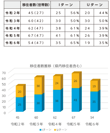 昨年のフェアでは、約100名の方の相談対応を行い、このフェアをきっかけに上島町へ移住し、協力隊や役場職員として勤務されている方や、移住とまではいかずとも観光や町内案内ツアーに参加するなど、上島町へ足を運んでくださる方もいます。また、昨年度の移住者数(転入時アンケートをご提出いただいた方で転勤・進学ではない理由で転入された人数)は54人となっており、そのうちIターン(上島町出身でない方)の方の割合が約65%となっていることから、上島町に何かしらの魅力を感じて移住された方が多いことを示しています。