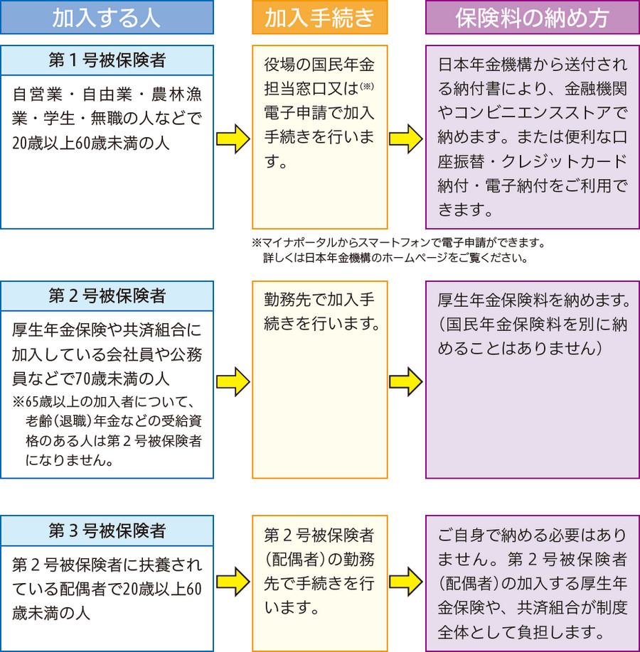 加入者の職業などによって3つのグループにわかれています。それぞれの加入手続きや保険料の納め方が異なりますので、自分がどのグループになるのかご確認ください。
