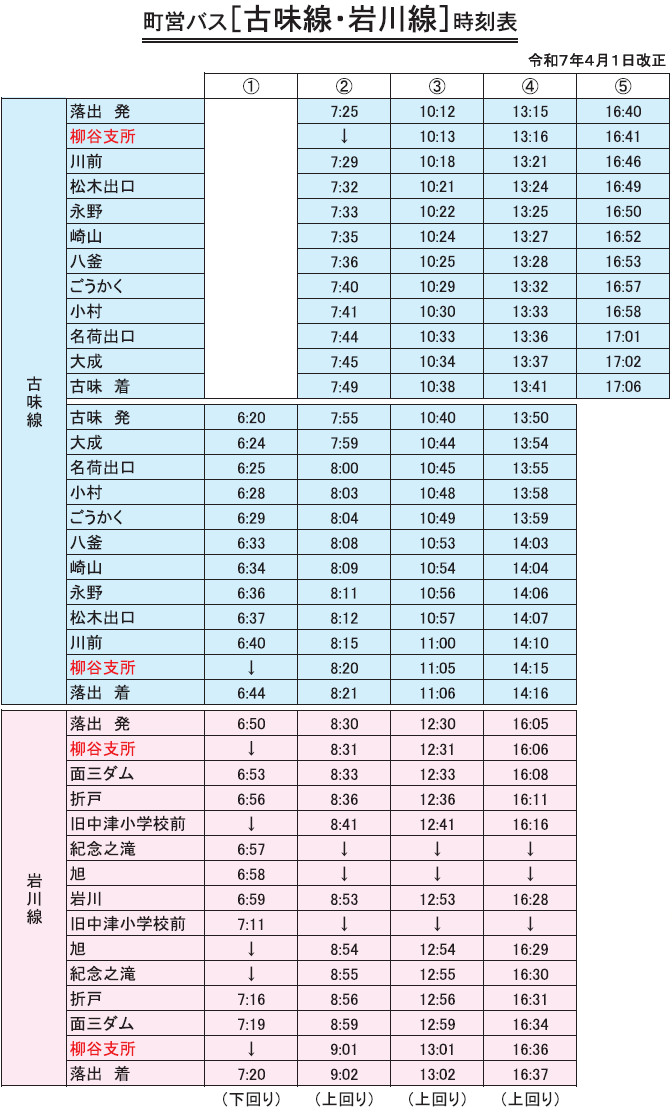 ジェイアール四国バス久万高原線のダイヤ改正に伴い、町営バス久万落出線、古味・岩川線についても、4月1日よりダイヤ改正を実施します。ご利用される際は、お間違えのないようご注意ください。