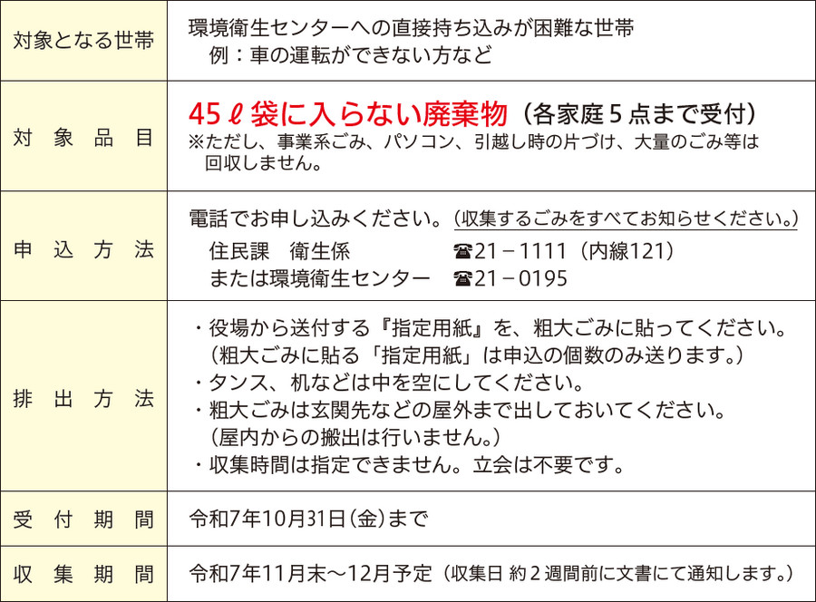 ※対象者以外の方は環境衛生センターへ直接搬入をお願いします。(無料)