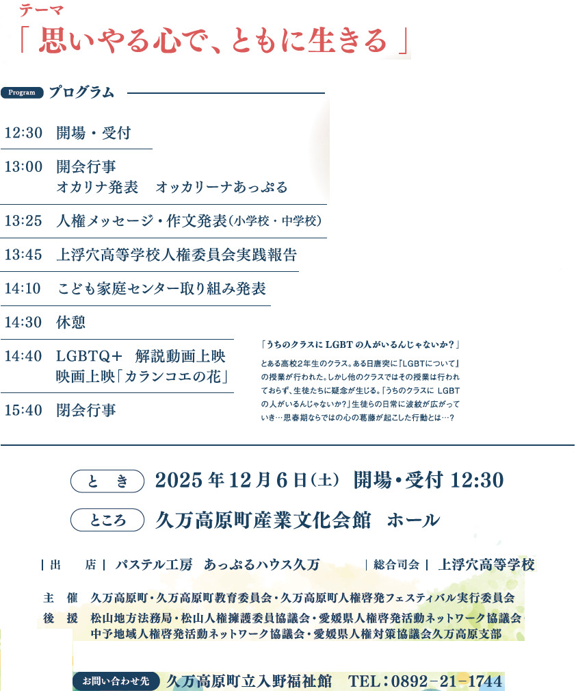 イベント 人権啓発活動活性化事業 久万高原町 人権啓発フェスティバル2025(参加無料) 6/31 前の記事 次の記事 発行日 : 2025年11月19日 自治体名 : 愛媛県久万高原町 広報紙名 : 広報久万高原 2025年11月号 Tweet シェアする 令和8年度 こども園・幼稚園 入園のご案内 町道などの除雪作業および沿道の立木伐採などにご協力ください