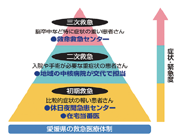 救急医療機関は重症度・緊急性に応じて段階的に対応する体制となっています。
