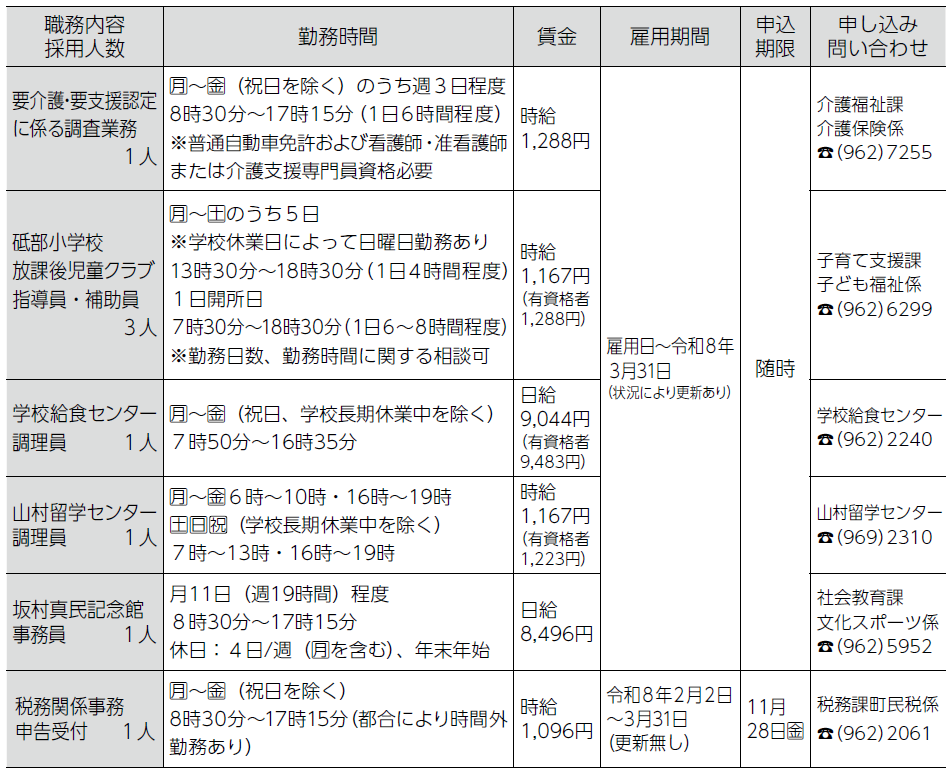 しごと 〔お知らせ〕令和7年度 会計年度任用職員募集中 25/44 前の記事 次の記事 発行日 : 2025年11月01日 自治体名 : 愛媛県砥部町 広報紙名 : 広報とべ 令和7年11月号 手当てなど:通勤手当あり、雇用期間により有給休暇あり、勤務時間により期末・勤勉手当あり共済保険・厚生年金・雇用保険の加入制度あり 申込方法:履歴書(写真を貼る)を直接または郵送で各申込先に提出 採用方法:書類および面接により決定 Tweet シェアする 〔お知らせ〕令和7年度 第3回町職員採用試験実施 情報あれこれ