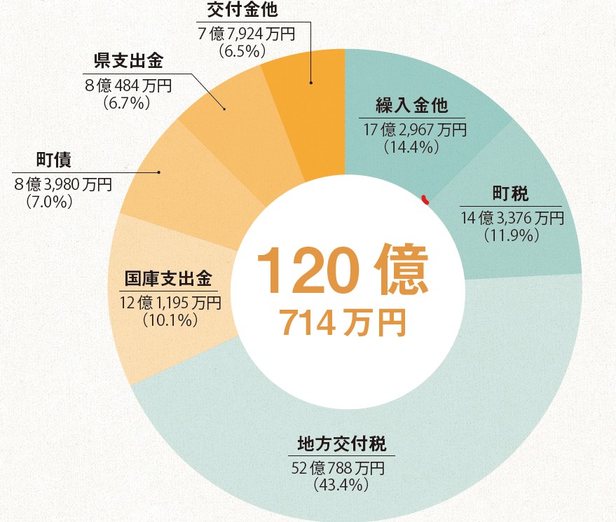 交付金他……地方消費税交付金やゴルフ場利用税交付金など、町の規模などに応じて交付されるお金。ここでは地方譲与税も含めている