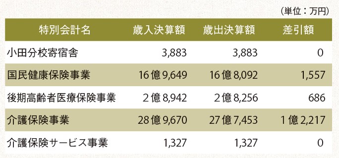 特別会計は一般会計と区分し、特定の収入と支出で経理を行う会計です。小田分校寄宿舎および介護保険サービス事業は、一般会計からの繰入金によって収支が一致しています。