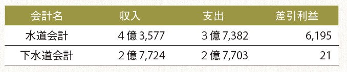 《水道事業会計》大瀬中央鵜川地区で水道未普及地域解消工事を、五十崎・平岡地区で配水管耐震化工事を、小田地域で旧簡易水道施設統合工事を実施しました。安全な水を提供するため、計画的に整備を進めます。