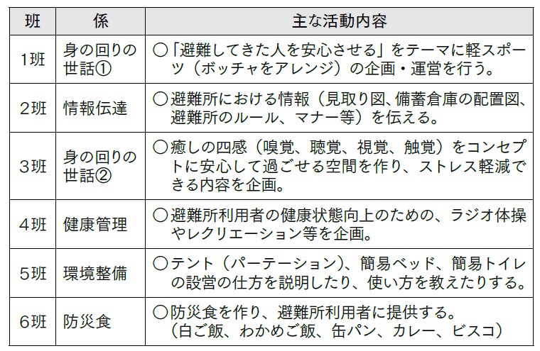 三崎中学校では、総合的な学習の時間に防災教育『避難所における中学生ができるボランティア』について考えました。その際、三崎高校生にもアドバイザーとして参加していただきました。生徒たちは、自分たちにできることをしっかり考え、避難者がどのようなことを必要としているかについて、班の友達と意見を交流させ、次の表のような活動に取り組むことにしました。