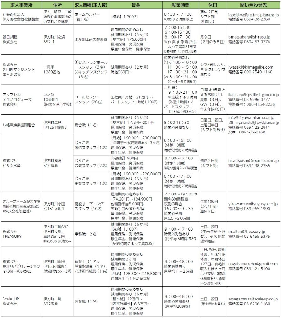 町民や伊方町への移住を考える方に広くお知らせし、町の農・水・商工業などの発展や企業立地、促進・雇用対策のため、「広報いかた」において無料の求人情報を毎月掲載します。