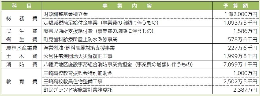 今回の補正予算額は3億7,022万8千円で、累計123億2,028万8千円となりました。三崎高校教員の町内居住を促進することを目的に、愛媛県と共同で老朽化した教員住宅の改修を行うための経費のほか、町見歯科診療所屋上防水改修事業、漁業燃油・飼料高騰対策支援事業、公営住宅湊団地火災跡復旧工事、伊方消防署建設事業費の増額に伴う負担金、三崎高校教育振興会特別補助金、町民グランドの整備に係る実施設計業務などの経費が盛り込まれています。