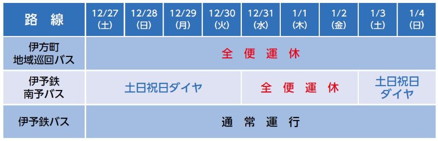 ・伊方町地域巡回バス…年内は12/26(金)まで、年明けは1/5(月)から通常運行です。