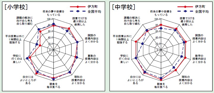 ・児童生徒質問紙調査では、「週3回以上のICTの使用」「自分にはよいところがある」「国語の授業内容はよく分かる」「理科の授業内容はよく分かる」の項目は、全国平均を上回っている。一方、「学校に行くのが楽しい」「平日授業以外に1時間以上勉強する」「算数の授業内容がよく分かる」「課題の解決に向け、自ら考え自ら取り組む」の項目が、全国平均を下回っている。