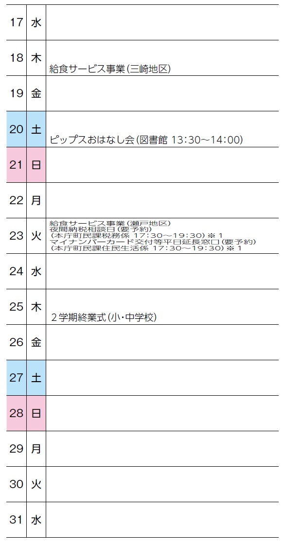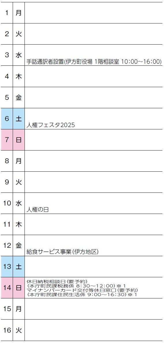 くらし 12月くらしのカレンダー 14/37 前の記事 次の記事 発行日 : 2025年11月26日 自治体名 : 愛媛県伊方町 広報紙名 : 広報いかた 2025年12月号 ※1 開設は本庁のみです。開設日の3日前(土日祝日を除く)までに電話でご予約ください。 納税相談予約【電話】38-2650 マイナンバーカード交付等予約【電話】38-2653 Tweet シェアする IKATA Information-町からのお知らせ 募集・お知らせ 12月3日~9日は障害者週間です